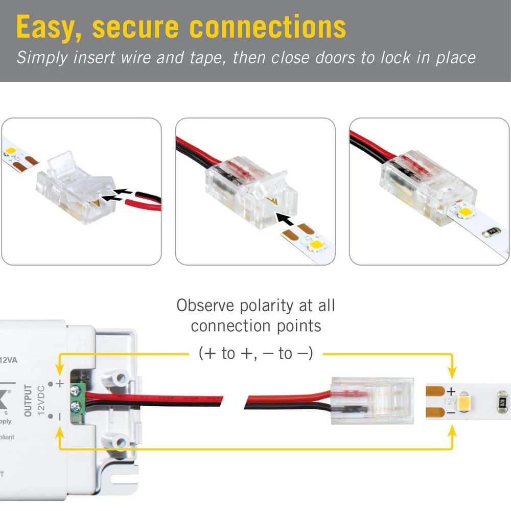 The newly improved 2 Pin Wire to Tape Splice Connectors from Arm cost Lighting are the most efficient way to connect 2 sections of LED tape light into 1 continuous strip. Now with designated channels for wire insertion, installing the connectors is quick and easy. Bridge gaps or create custom-length LED strip lights without soldering or wire stripping. 2C White/Single Color Connectors are used for single color, 8 mm LED tape lighting. Compatible with both indoor and outdoor RibbonFlex circuits.