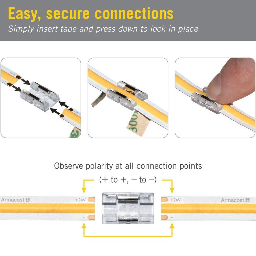 2-Pin COB Tape to Tape Connectors from Arm cost Lighting are used to connect 2 sections of white or single color COB tape light into 1 continuous strip. Easy to use, no soldering, tight, secure connections for 2C COB tape light. Great for large or custom undercabinet and accent LED lighting installations for residential, commercial, RV and boating.