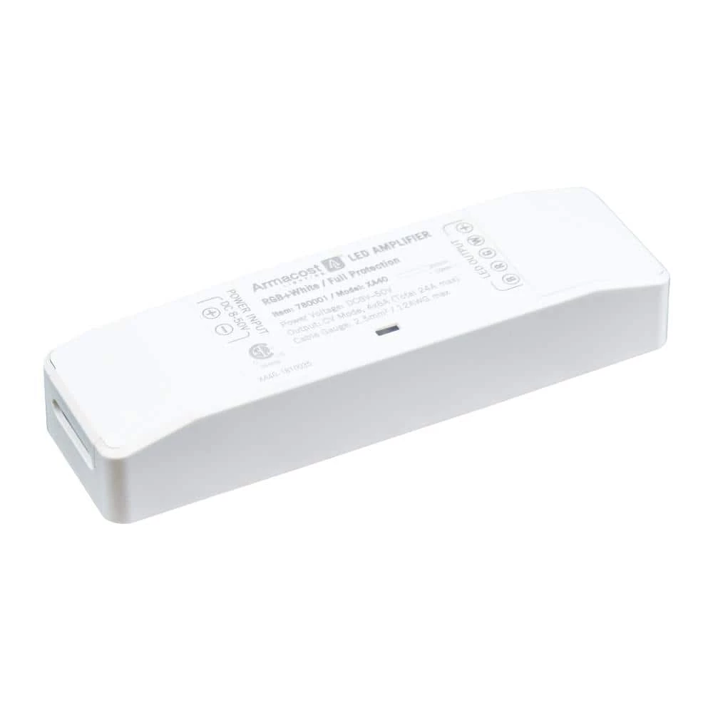 The Armacost Lighting ProLine RGB plus White LED Amplifier is the perfect solution for large overcoming voltage drop in large LED lighting installations. The LED lighting amplifier uses professional grade components to repeat/amplify the RGB plus W signal to deliver enhanced lighting control and synchronization over a large area. Featuring proprietary high speed optocouplers, the RDG plus W LED repeater keeps LED lighting colors and effects synced regardless of the number of amplifiers installed. When paired with an RGB plus W controller, the amplifier can communicate with LED lighting up to 200 ft. away. The LED RGB plus White LED Amplifier, repeats/amplifies the LED lighting signal, not the power. Each amplifier requires a separate power supply.