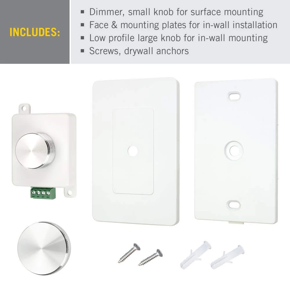 The ProLine Rotary Knob LED Dimmer from Armacost Lighting works with 12-Volt or 24-Volt DC white or single color LED lighting to provide smooth and flicker-free 0-100% dimming. Ideal for your under cabinet or accent LED lighting project. The slim, low-profile dimmer comes with 2 rotary knob choices and face and mounting plates for in-wall installation. The push button on/off knobs allow you to save your preferred dimming level. Couple with the Armacost Lighting Wall-Mount Wireless Touchpad (item#523121, sold separately) for completely wireless, RF dimming control of your LED lighting. Not for use with 120-Volt or multi-color LED lighting.