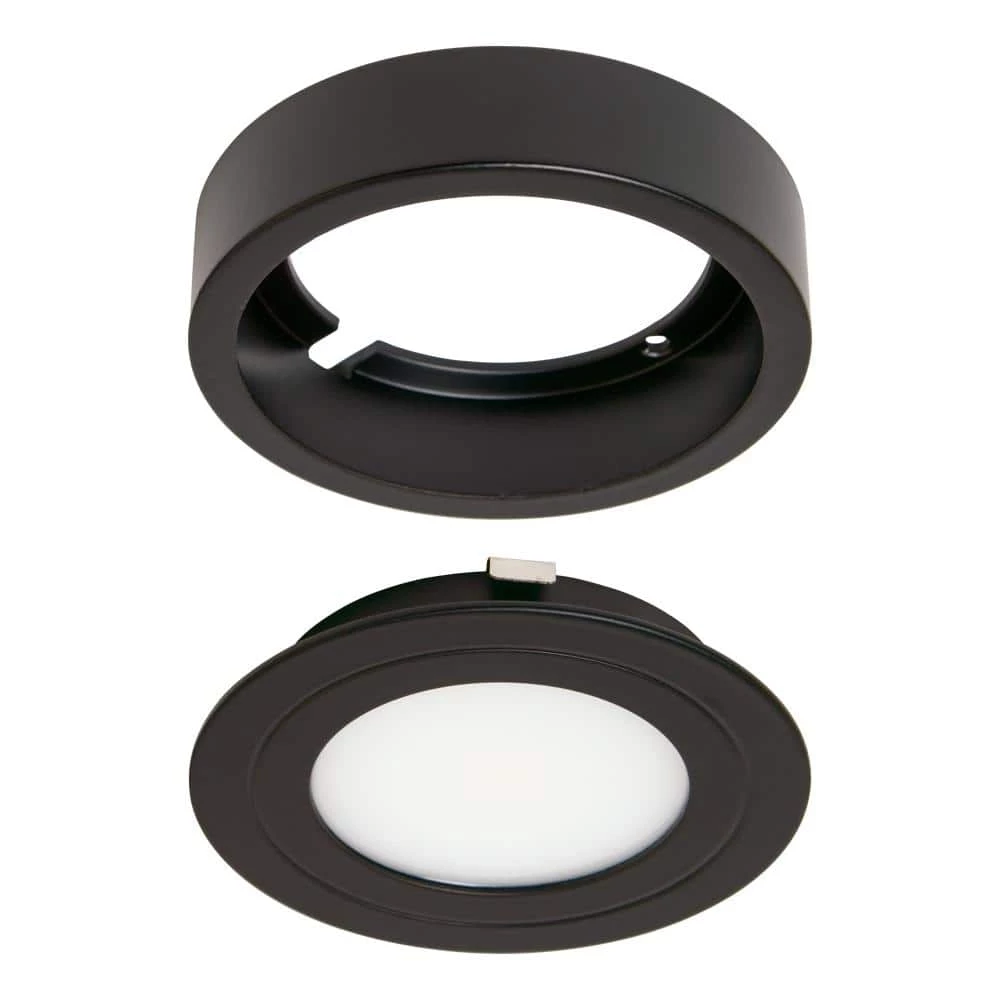 Measuring only 5/8 in. thick, PureVue LED lights can be configured as a sleek surface mounted puck or a flush, ultra-thin downlight when recessed mounted. The diameter is 2-3/4 in. and the fixture uses high quality all metal construction and has a brushed steel finish. Each light comes pre-wired with a 36 in. color-coded power lead for easy direct wire connection. 12-Volt low-Voltage safe, simply cut or extend cables to meet any installation need. Lights can be installed individually, linked together, or combined with Armacost LED tape lighting in the same circuit. The number of lights installed is limited only by the output rating of the power supply.