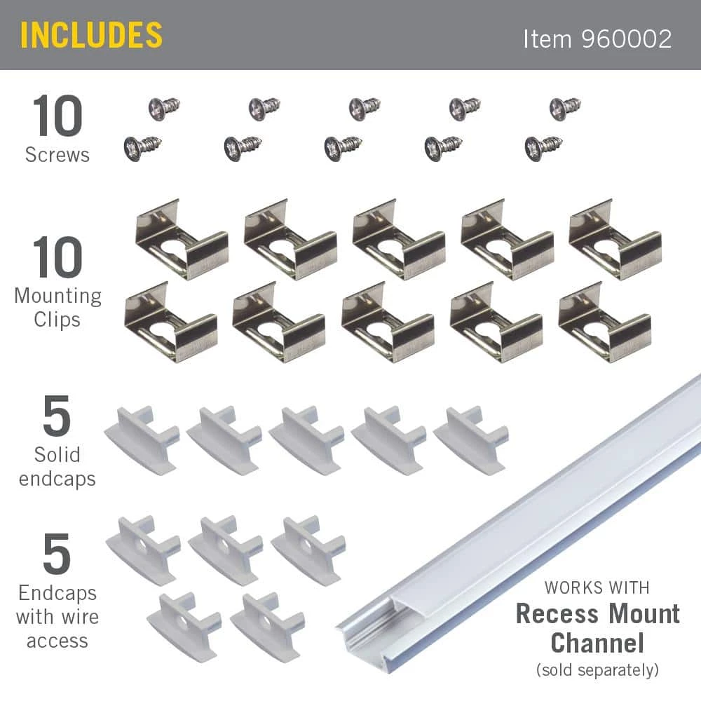 Accessory packs to mount LED Tape Light Channels from Armacost Lighting. LED Tape Light Channels are ideal for installations where the lighting will be visible, such as on the underside of a shelf or in a display cabinet. Accessory packs available for Corner Mount, Recess Mount, Surface Mount, Bendable, and U-Shaped LED strip light mounting channels.