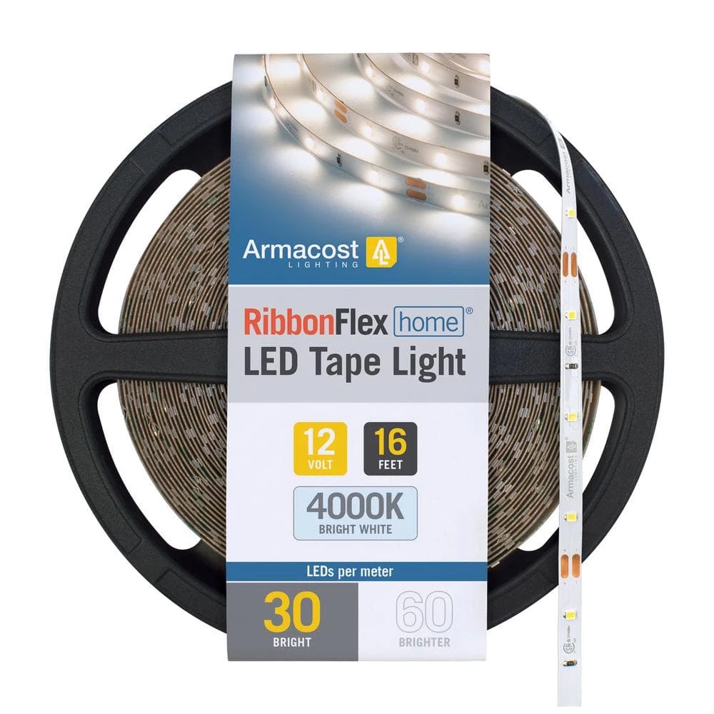 Armacost Lighting’s RibbonFlex Home White LED Strip Light Tape is an easy-to-use solution for illuminating any room or surface with a dimmable accent light. Our RibbonFLex Home series provides good performance at a great value. 30 LEDs per meter create a subtle light, excellent for indirect accent lighting projects in smaller areas like closets and shelves, workshops, craft rooms and display cases. Tape light can be used as-is or cut to size for custom installations. Cut strip pieces can be securely reconnected using the included LED light strip connector to extend length or go around corners. The flexible LED strip lights feature ultra-strong 3M mounting adhesive, which makes installation is quick and easy. LED strip lights require a 12-Volt power supply (sold separately).