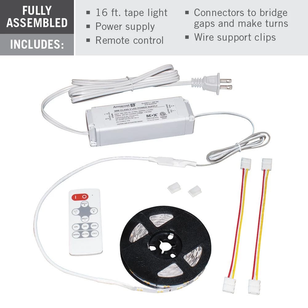 The Armacost Lighting Tunable White LED Tape Light Kit is a perfect all-around solution for any kitchen, bedroom or living room installation. The strip light kit features selectable color temperatures between soft white 2700K and bright-white 5000K options. Using the included RF (Radio Frequency) remote the LED light kit is fully dimmable from 100% to 0% brightness. Control up to three kits with a single remote for larger, custom installations. Cannot be used with AC dimming switches.