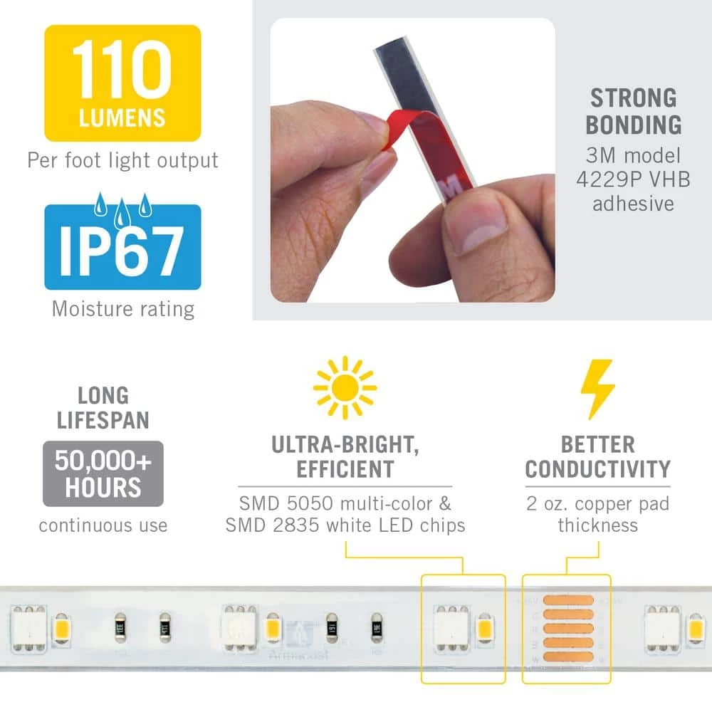 Armacost Lighting’s Multicolor plus White (RGB plus W) RibbonFlex Pro 24-Volt Outdoor LED Tape Light features advanced IP67 waterproof technology that is ideal for any outdoor home or commercial project. The weatherproof strip lights include 30 RGB and 30 White LED diodes that deliver multiple color options and soft bright white light, making it perfect for subtle or low-light accent lighting. Rated up to IP67, which means it is waterproof, but not meant to be used fully submersed underwater. Ideal for outdoor LED accent lighting projects, such as decks, porches, landscapes, vehicles, docks and more. IP67 rated tape light is 100% protected from dust and sand and protected against immersion in water between 5.9 in. to 39.37 in. (15 cm to 1 m) deep for up to 30-minutes. The 24-Volt silicone coated LED tape light is great for longer length installations while still being energy efficient.