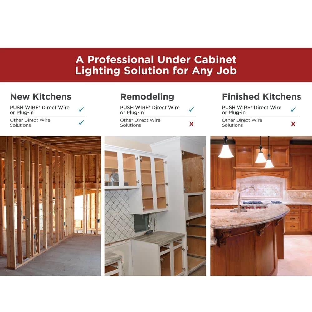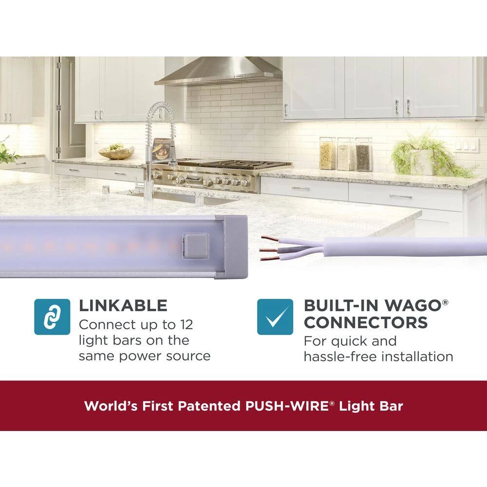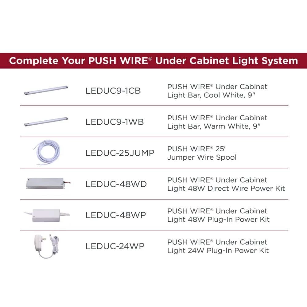 Say goodbye to complicated and expensive under cabinet lighting systems with Black+Decker push-to-connect light bars – engineered for the busy electrician. Use the Push Connect 9 in. under cabinet light bar in cool white (also offered in warm white with LEDUC9-1WB) for finished kitchens, new kitchens and even renovations to save installation time and money by allowing any on-the-job customization. With 320 Lumens and 4-Watt illumination at a cool color temperature of 4000 Kelvins, this ultra-thin light bar is perfect for any under cabinet job. Each bar produces a flicker-free light zone up to 36 in. for free-flowing, diffused illumination. Purchase includes a single 9 in. light bar and 2 wire clips. Jumper wire (LEDUC-25JUMP – not included) and your choice of adapters (LEDUC24-WP, LEDUC48-WP and LEDUC48-WD – not included) required.