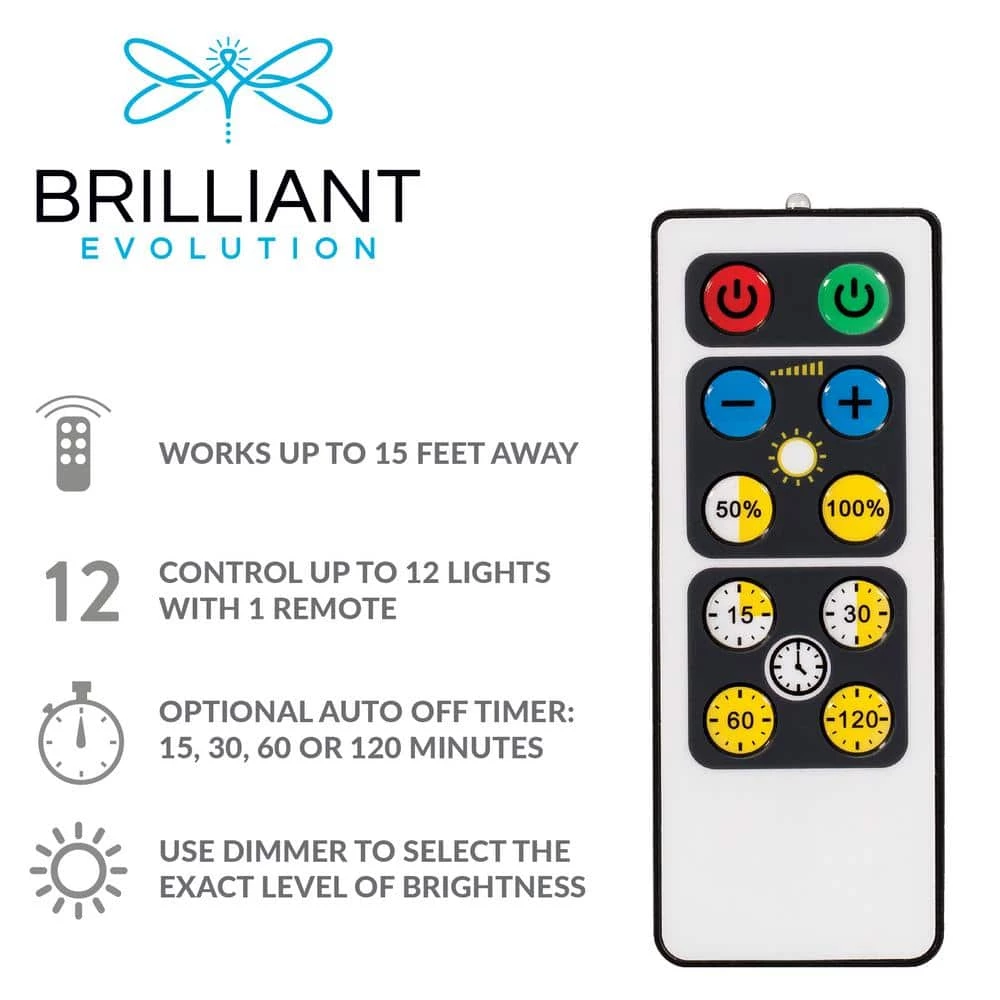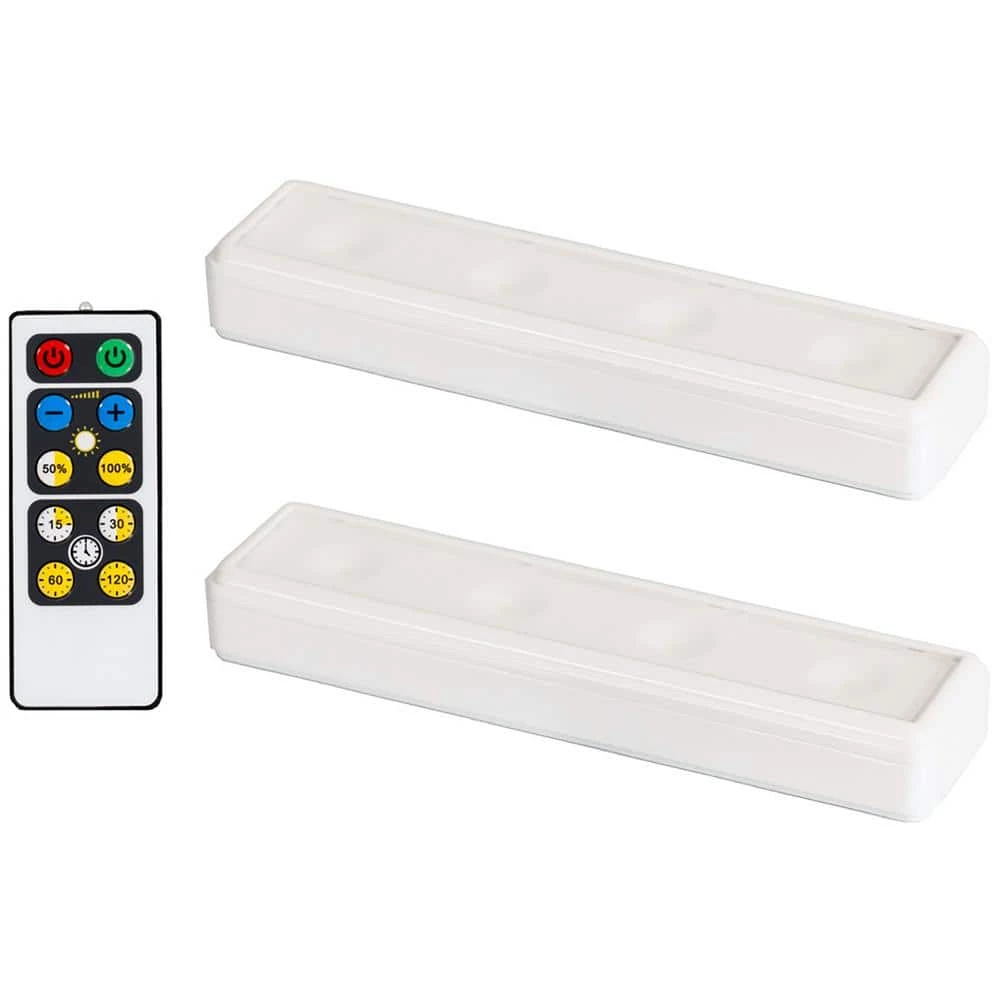 The Wireless LED Under Cabinet Light With Remote is super bright at 80 Lumens. The LEDs are 3000K and give off a warm white glow. Use the remote to turn the under cabinet light on/off up to 15 ft. away. Control up to 12 under cabinet lights with one remote. There is also an on/off tap lens. Set the brightness to 50% or 100% with the preset dimmer buttons or use the minus or plus buttons to select the exact level of brightness. There is an optional timer that will automatically turn the lights off in 15, 30, 60 or 120-minute. The under cabinet light mounts with screws or adhesive tape (both are included). The light operates on 3 AA batteries (not included) and has a run time of over 100-hour. The run time is 4 times longer than other battery operated under cabinet lights. Measures 8.5 in. W x 2 in. D x 1.1 in. H.