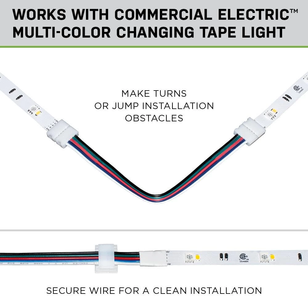 Customize multi-color plus white tape light installation. This set enables short jumps and turns in under cabinet and other LED strip light applications. Compatible with all CE color plus tape light. Connector set includes 4 x 6 in. snap connectors and 4 wire mounting clips. Perfect for under cabinet LED strip lights.