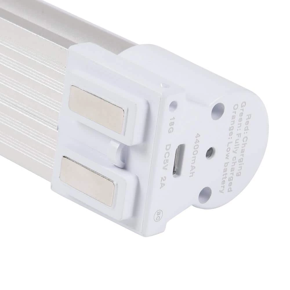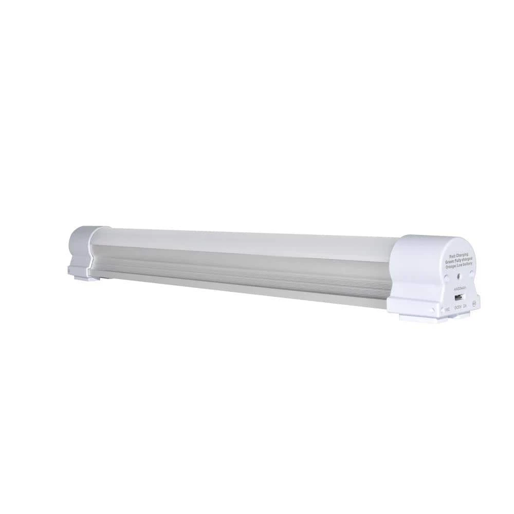 Perfect for performing tasks and for recreational uses, this rechargeable 13.5 in. LED Portable Task Light is bright and versatile. A durable light built with aluminum case for use over a long period of time and the LED light produces over 630 Lumens. It is powered by a 4400m Ah Li-ion battery, rechargeable by common DC 5-Volt 2 Amp charger. in addition to providing outstanding illumination, it also features 3-dimmable brightness levels with strobe and SOS modes. for convenient installation, there are strong built-in magnets on both end caps and it comes with adhesive strip pads for easy attachment to various surfaces. It is ideal for outdoor use, for emergency lighting, car repairs, camping, boating or at a cookout. It is also suitable for doors in workshops, garage, basement, kitchen or around the house, backyard and good for under cabinets.