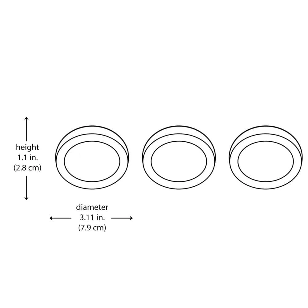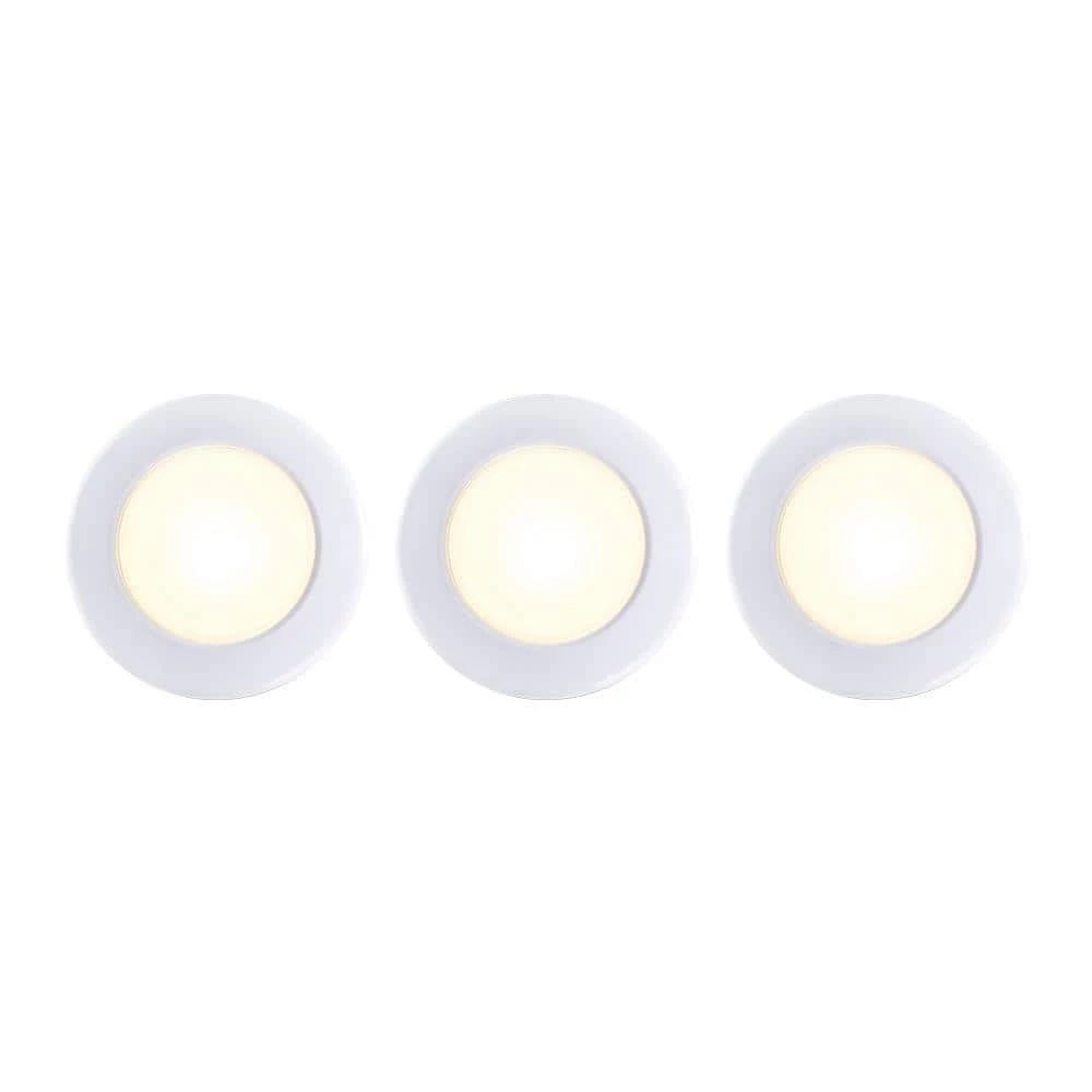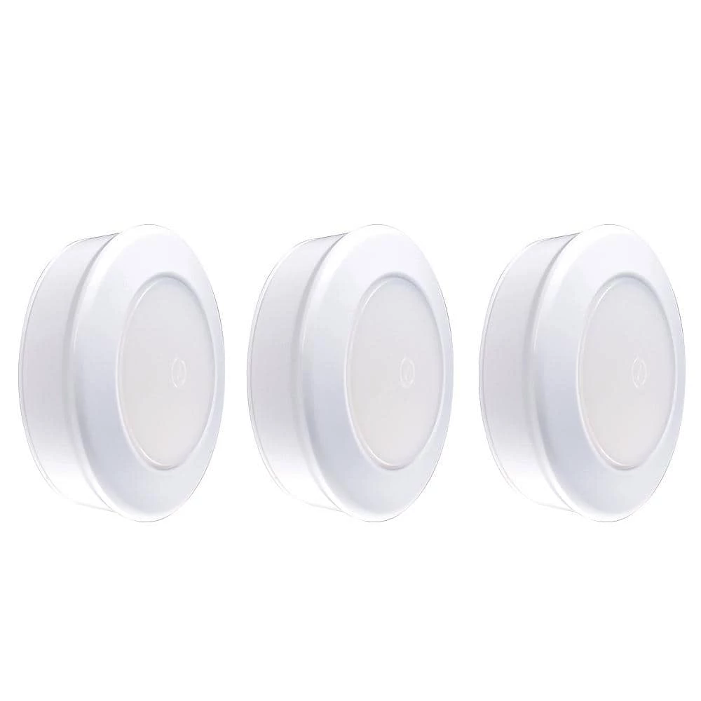These powerful color-changing LED puck lights are easy to install and convenient to use with included remote control. Place them anywhere in your home where additional light is needed and a hardwired installation is not an option. Apply to nearly any surface using the double-sided adhesive tape included, or mount more permanently using the mounting screws provided. Each puck light requires 3 AAA batteries and can be controlled by pressing the light on/off, or by using the included remote control. Remote control includes on/off, dimmer, color changer, and timer. The LED bulbs shine brightly and are designed to last for years without burning out. These puck lights are ideal for use under cabinets, in boats or autos, in outdoor sheds, or any place bright light is needed without the hassle of wiring. Sold in packages of 3.