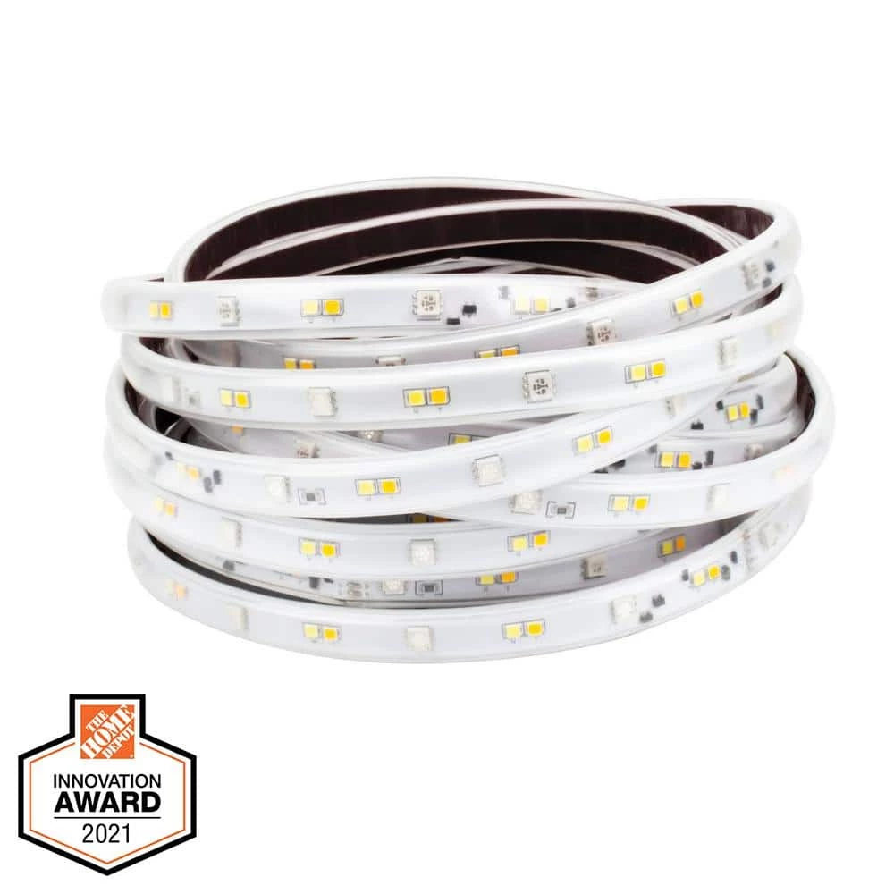 This 32 ft. RGB plus Tunable White Smart LED Tape Light is the perfect lighting solution for any indoor or outdoor application. This smart tape light pairs with Home Depot’s Hubspace App to control. Select from a wide spectrum of colors, including a tunable White. Includes dozens of pre-programmed light settings and modes. Also pairs to Amazon Alexa and Google Assistant. Also includes Remote Control for easy use.