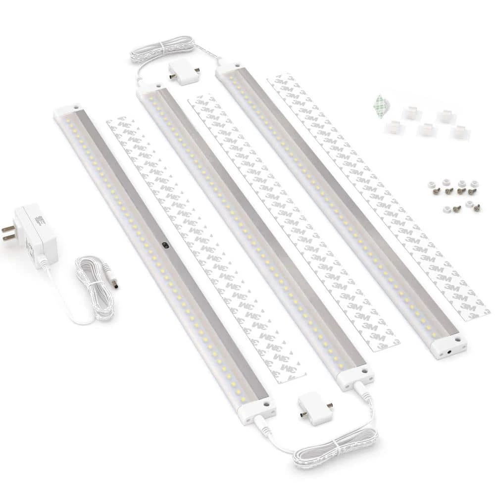 Discover Dimmable Hand Wave Activated LED Lighting with This 3-Bar Under-Cabinet LED Lighting Kit. With 3 LED bars, a 15-Watt power supply and a full complement of screws, wire clips and stickers, you’ll have everything you need to install warm, energy-saving light in your kitchen, pantry, garage, office, workshop, RV and more. Wave Your Hand: That’s all it takes to turn on or off your lights, hold your hand under the sensor, you can adjust brightness from 10% to 100%. Quick Install: For the quickest and lowest profile install, simply use the included double-sided stickers. Whether you want to install all 3 lights together in a chain or spread them further apart beneath your cabinets, this kit includes everything you’ll need.