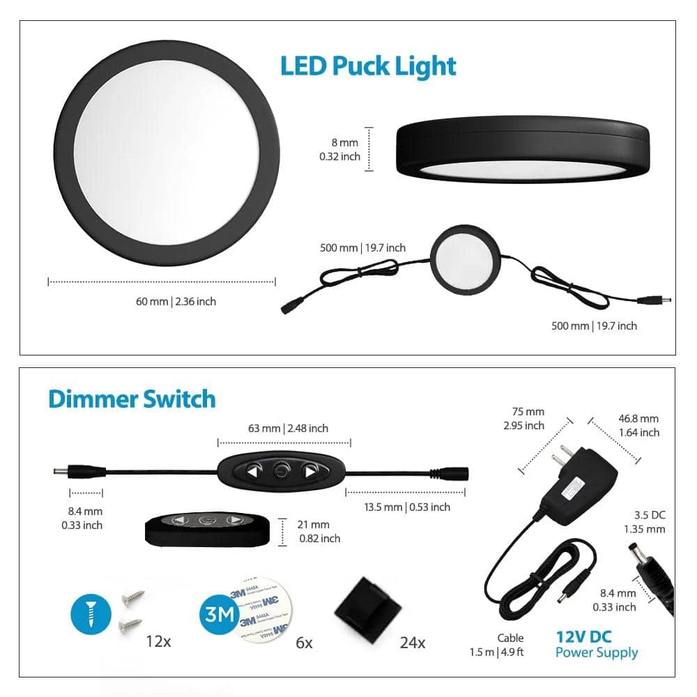 - Included: 6 LED puck lights, 24 wire clips with 3M sticker, six 3M double-sided stickers, one 12-Watt power supply (with 4.9 ft. cord), 1 dimmer switch