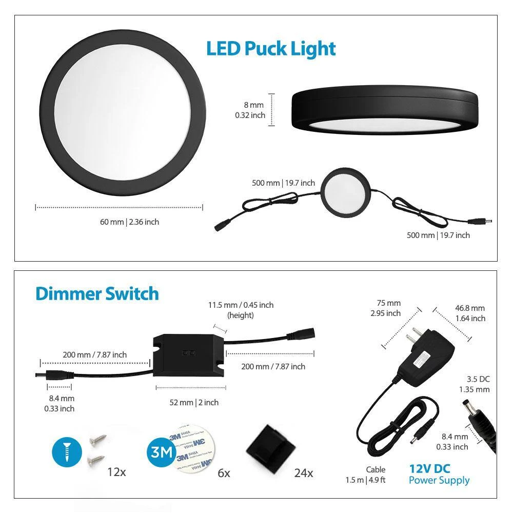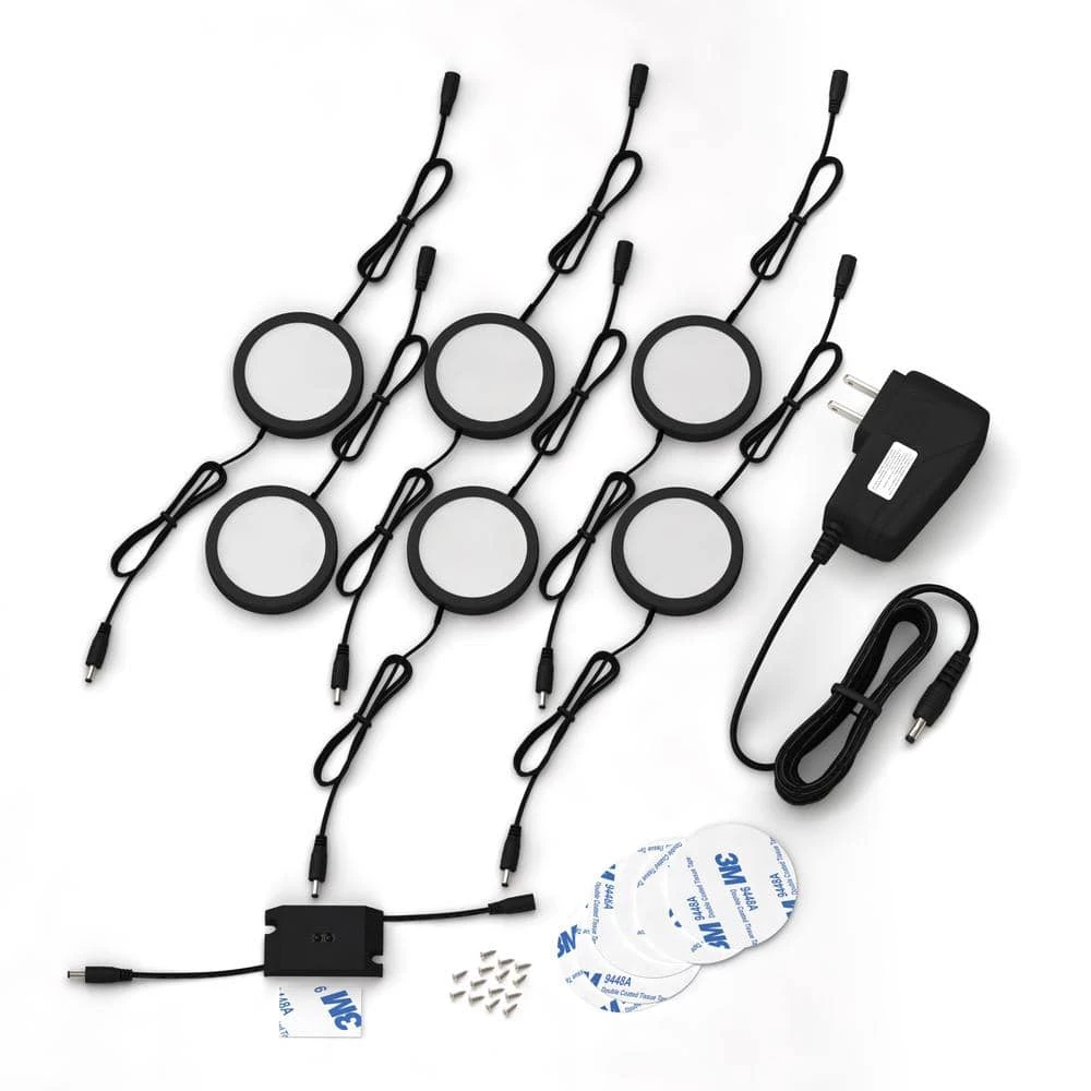 - Included: 6 LED puck lights, 24 wire clips with 3M sticker, six 3M double-sided stickers, one 12-Watt power supply (with 4.9 ft. cord), 1-hand wave sensor
