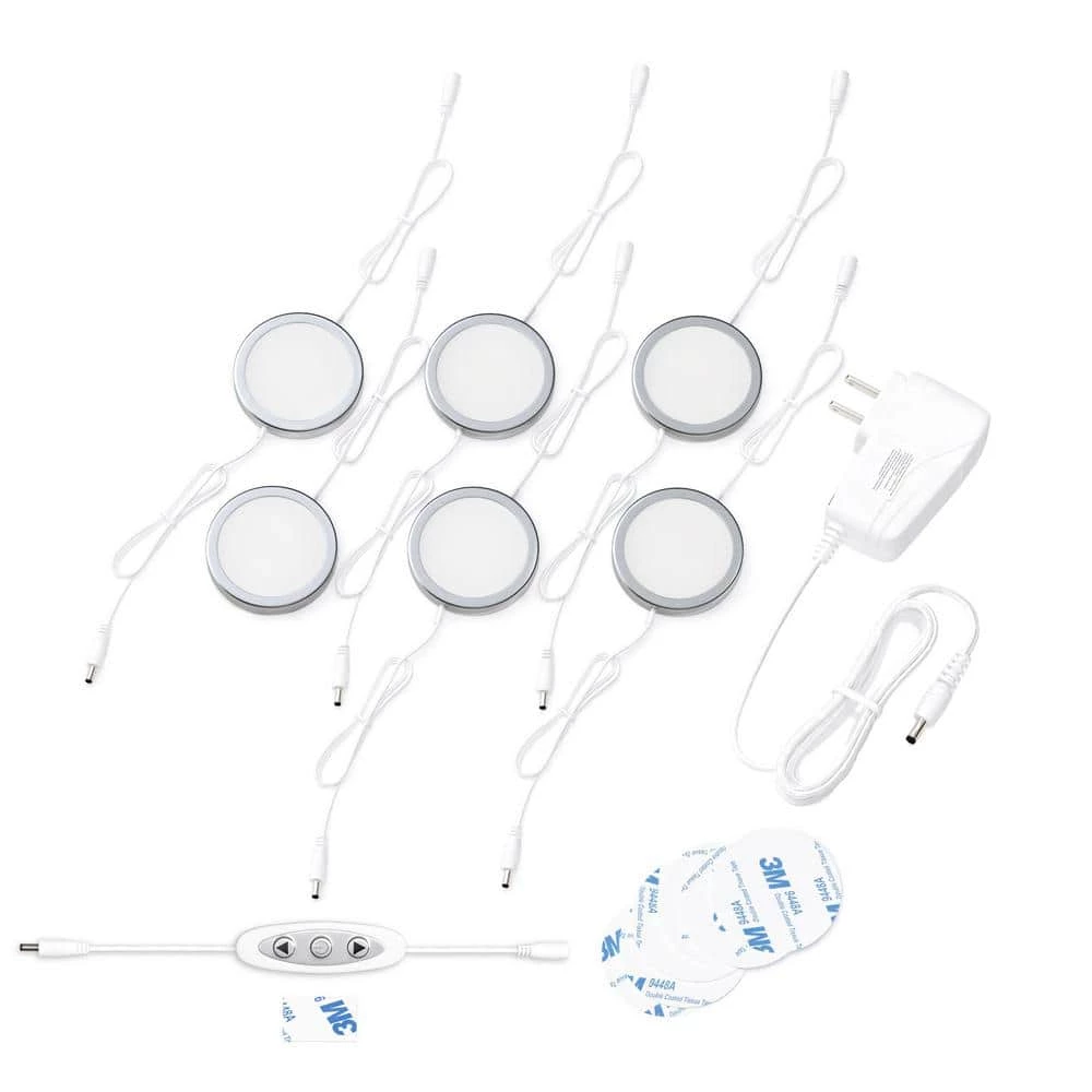 - Included: 6 LED puck lights, 24 wire clips with 3M sticker, six 3M double-sided stickers, one 12-Watt power supply (with 4.9 ft. cord), 1 dimmer switch