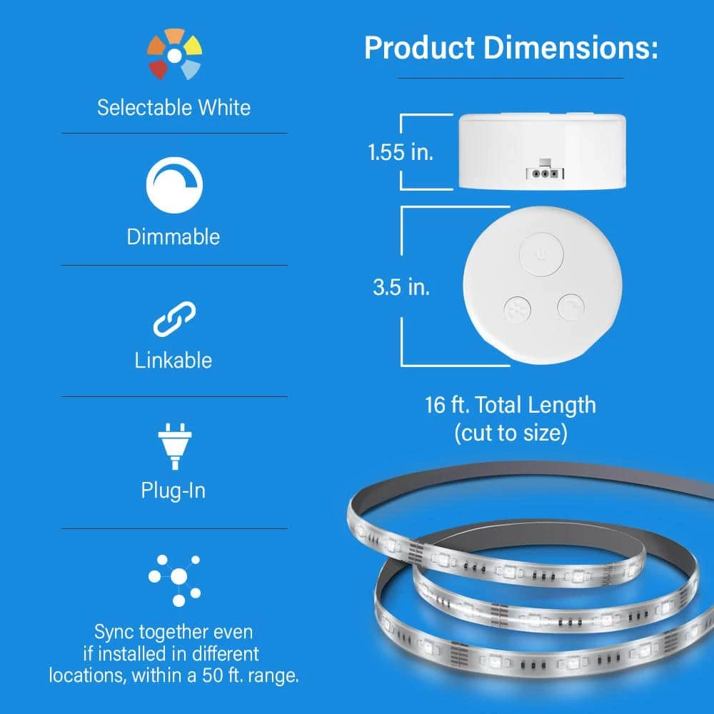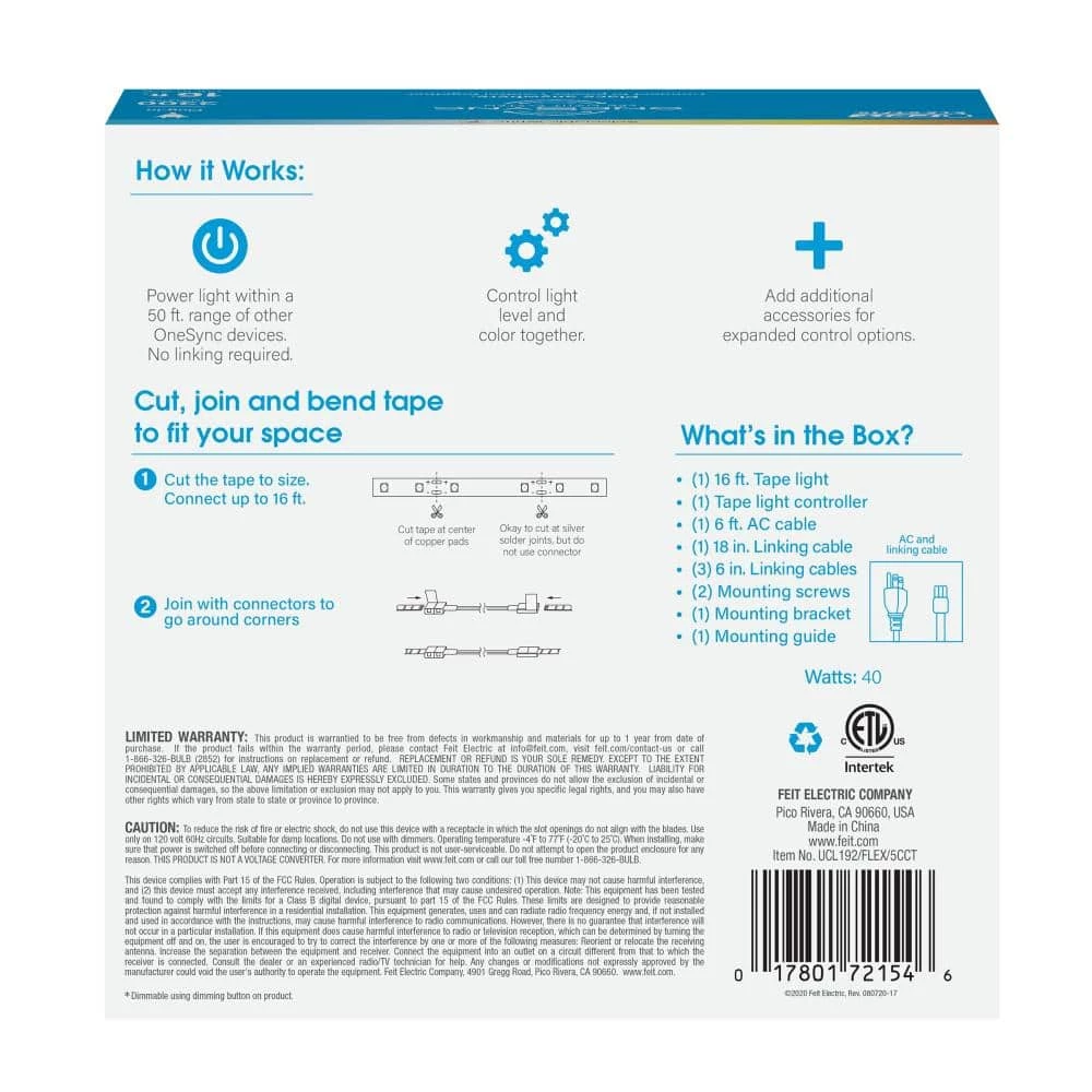 Give your kitchen counters extra beauty and functionality with the Feit Electric UCL192/FLEX/5CCT color-selectable undercabinet LED tape. This 16 ft. strip with embedded LEDs plugs into the nearest outlet with a 6 ft. AC cable and instantly provides additional accent lighting. Change color temperatures or adjust brightness with the push of a button on the fixture or a separately sold remote control. Link multiple units or cut a portion of the tape for greater coverage. Choose a dependable Feit Electric undercabinet fixture for your kitchen lighting needs. Power light within a 50 ft. range of other OneSync devises. No linking required.