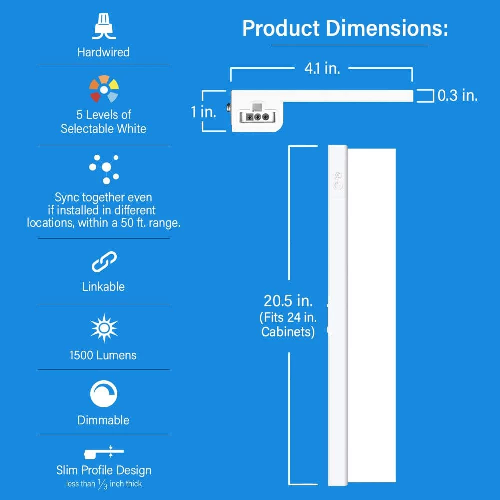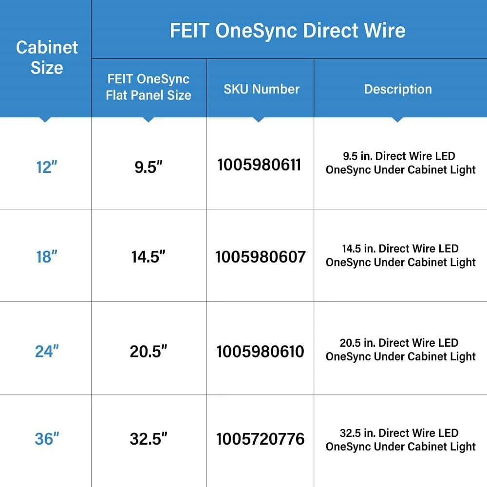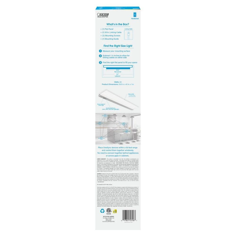 Beauty meets functionality. Each under cabinet LED flat panel light fixture is designed with a sleek, slim profile that flawlessly fits 24-inch or longer cabinets. For under cabinet lighting that instantly transforms your kitchen, office space, closet, and more, choose Feit Electric OneSync UCL24FP/5CCTCAG2 color selectable Under Cabinet Flat Panel. Enhance your space by selecting from five white light options or adjusting the brightness level. Immerse yourself into a cozy Warm White (2700K), Soft White (3000K), Neutral White (3500K), Bright White (4000K) or invigorating Daylight (5000K). Evenly distribute 1500 Lumens of light and adjust to your preferred light output at your command with a touch of a button on each fixture or by pairing with a OneSync remote. Feit Electric OneSync Under Cabinet Flat Panels are engineered with hardwiring capabilities eliminating the need for unpleasant, exposed wires. Customize your under cabinet flat panel lights by linking up to 100 fixtures together or pairing them with other OneSync accessories. You can conveniently control multiple flat panels at once up to 50 Feet with just one fixture or remote. Say hello to the future of under cabinet lighting with Feit Electric OneSync Under Cabinet LED Flat Panels.