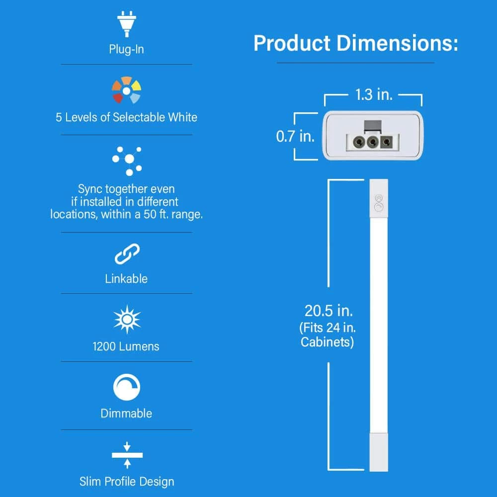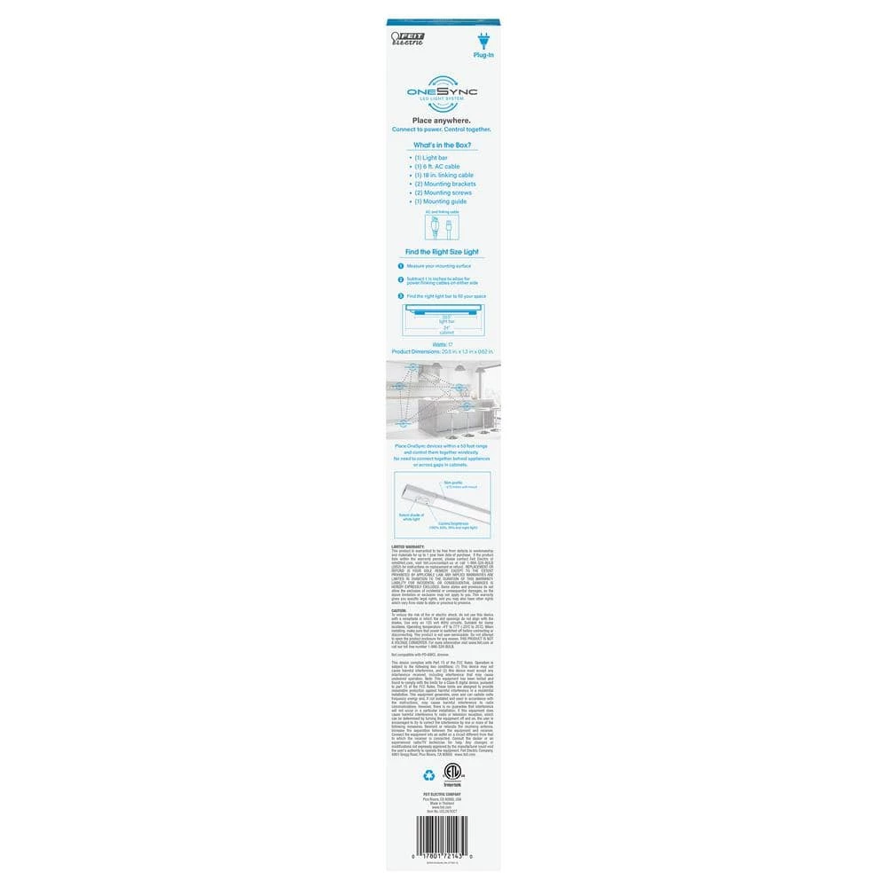 Beauty meets functionality. Each under cabinet LED light fixture is designed with a sophisticated, unobstructive profile that flawlessly fits 24-inch or longer cabinets. For under cabinet lighting that provides a professional, modern look your kitchen, office space, closet, and more, choose Feit Electric OneSync UCL24/5CCT color selectable Under Cabinet Bar Lights. Enhance your space by selecting from five white light options or adjusting the brightness level. Immerse yourself into a cozy Warm White (2700K), Soft White (3000K), Neutral White (3500K), Bright White (4000K) or invigorating Daylight (5000K). Uniformly distribute 1200 Lumens of light and adjust to your preferred light output at your command with a touch of a button on each fixture or by pairing with a OneSync remote. Feit Electric OneSync Under Cabinet Bar Lights give you the option of plugging-in to an outlet with the provided AC cable. You can also hardwire, eliminating exposed wires that create an eyesore. Customize your under cabinet flat panel lights by linking up to 100 fixtures together or pairing them with other OneSync accessories. You can conveniently control multiple bar lights at once up to 50 Feet with just one fixture or remote. Say hello to the future of under cabinet lighting with Feit Electric OneSync Under Cabinet LED Bar Lights.