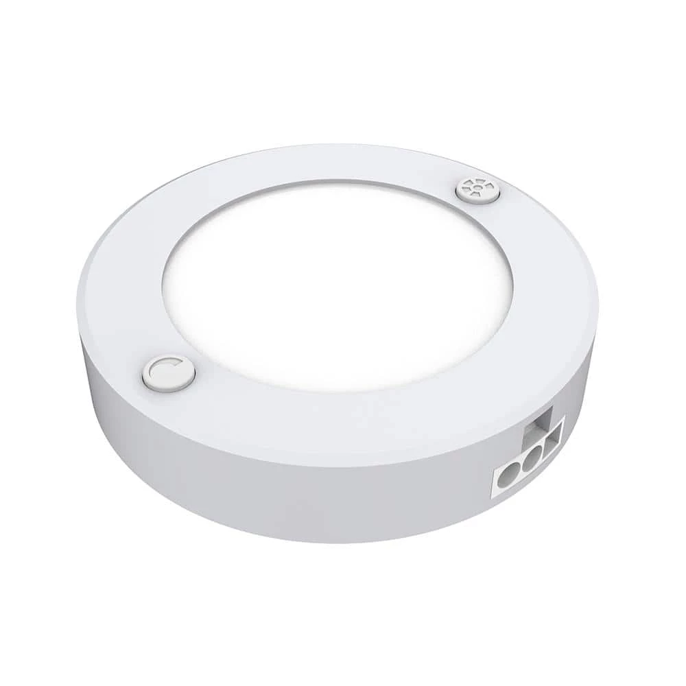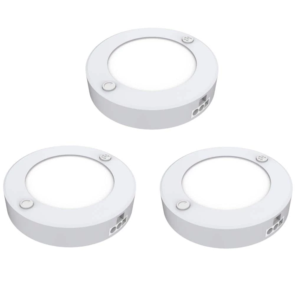 Give your kitchen counters extra beauty and functionality with the Feit Electric 3-pack of BPUCL/PUCK/5CCT/3 color-selectable undercabinet light fixtures. These 3 in. puck-shaped lights plugs into the nearest outlet with a 6 ft. AC cable and instantly provide 300 Lumens of additional light. Change color temperatures or adjust brightness with the push of a button on the fixture or a separately sold remote control. Link up to 3 of the pucks together for additional coverage the OneSync system automatically keeps them all the same color. Choose a dependable Feit Electric undercabinet fixture for your kitchen lighting needs.