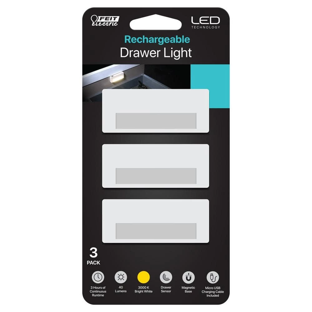 Feit Electric multi-function rechargeable battery undercabinet LED mini-lights give your space 3000K Bright White and 40 Lumens of light. They feature a modern space-saving, 2.6 in. compact design that makes them ideal for illumination in snug spaces. Their low-profile design allows them to easily fit into areas such as kitchen drawers, cabinets, closets or other dark, tight locations to provide extra illumination when needed. These lights contain an integrated motion sensor that instantly turns on the light when motion is detected so you won’t have to fumble with switches or buttons compared to other drawer mini lights. with the latest in LED technology, these lights use less power and energy compared to equivalent incandescent lights. Each mini light is equipped with a rechargeable battery which means you won’t need to plug in the light to power up. When the battery runs out, simply recharge with the included USB cable and continue using. with easy self-adhesive installation, just peel off the tape and push to stick on a flat surface, there is no need for extra tools. Adding beauty and functionality is easy with Feit Electric multi-function mini-lights.
