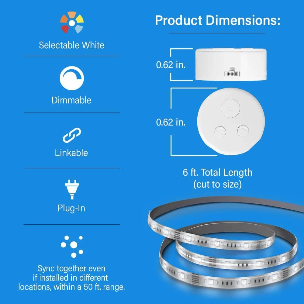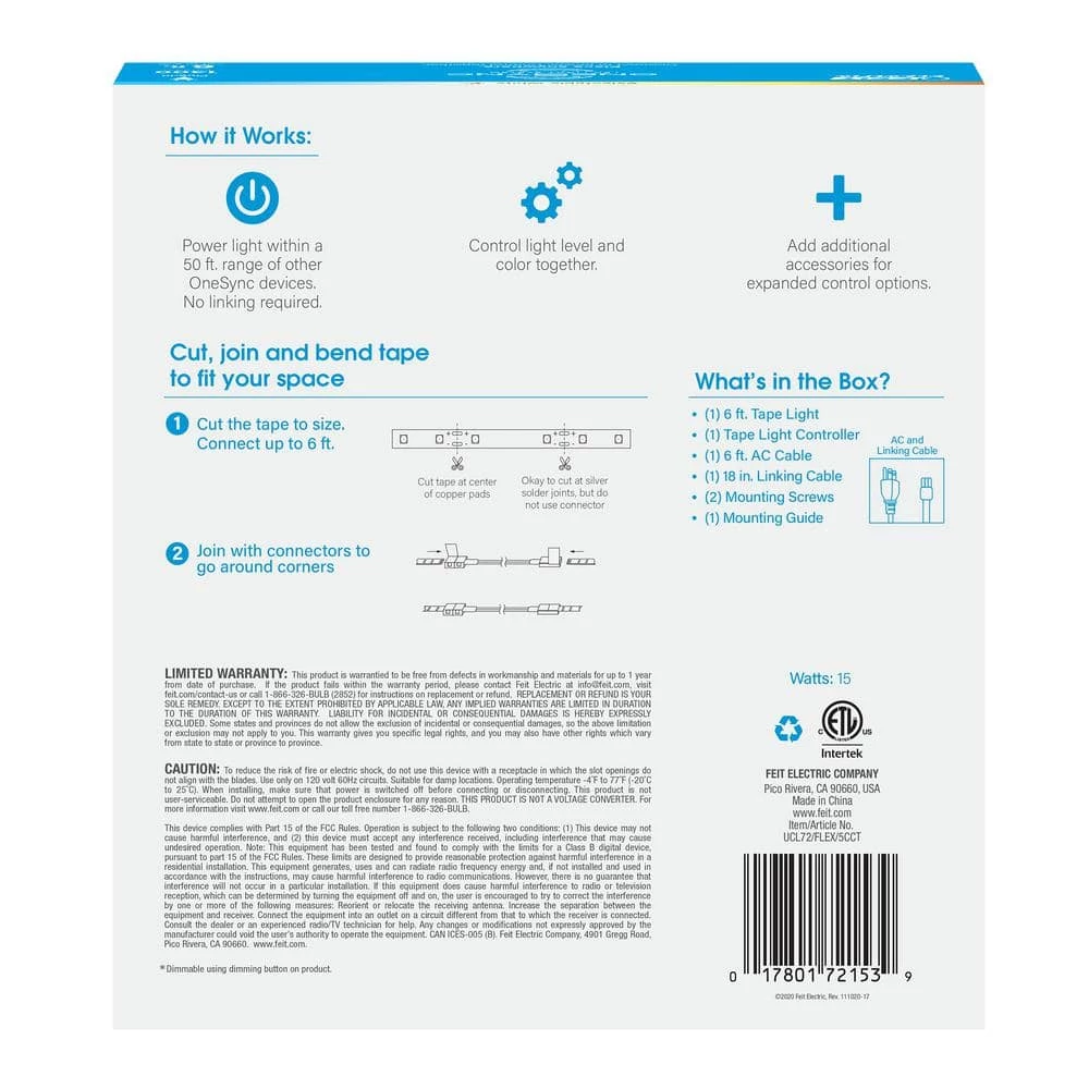 Beauty meets functionality. Choose Feit Electric 6 ft. OneSync UCL72/FLEX/5CCT color selectable Under Cabinet LED Tape Light for under cabinet lighting that provides a professional, modern look to your kitchen, under a toe kick, and more. Each tape light contains embedded LEDs and is designed to be cut, joined, and bent around corners for lighting that flawlessly fits any space. Plus, their shallow profile allows them to fit in both wide and narrow spaces. Enhance your area by selecting from 5 white light options or adjusting the brightness level. Immerse yourself into a cozy Warm White (2700K), Soft White (3000K), Neutral White (3500K), Bright White (4000K) or invigorating-daylight (5000K). Uniformly distribute 1400 Lumens of light and adjust to your preferred light output at your command with a touch of a button on the tape light or by pairing with a OneSync remote. Feit Electric OneSync Under Cabinet Tape Lights give you the option of plugging-in to an outlet with the provided AC cable. You can also hardwire with the OneSync Hardwire Convertor Junction Box to eliminate exposed wires that create an eyesore. Customize your under-cabinet tape lights by linking up to 6 lights together or pairing them with other OneSync accessories. You can conveniently control multiple tape lights at once up to 50 Feet with just 1 fixture or remote. Say hello to the future of under cabinet lighting with Feit Electric OneSync Under Cabinet LED Tape Lights.