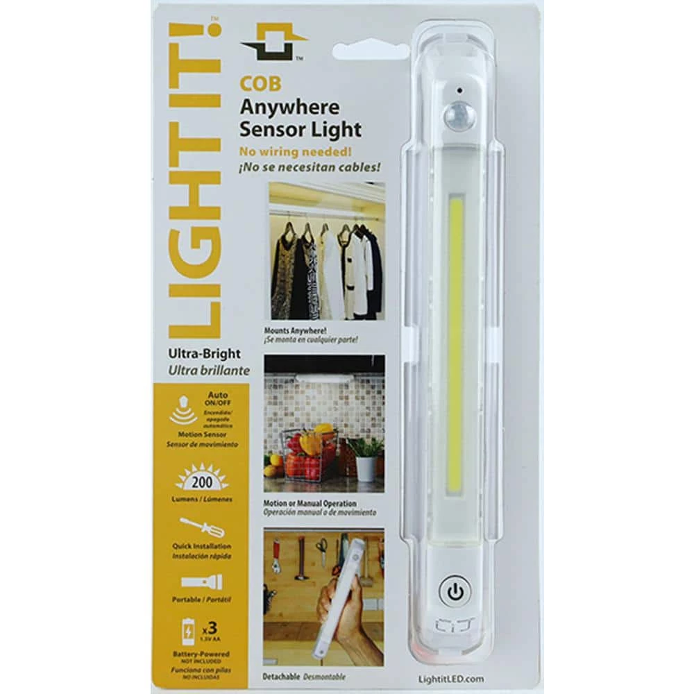 The Light It! 10-LED LightIt! Wireless Sensor Anywhere Light automatically lights up your closet, cabinet or any dimly lit space once motion is detected for simple, hands-free operation. It is equipped with 10 ultra-bright, cool-running LEDs that operate efficiently on three AA batteries (sold separately), automatically powering off 30 seconds after the last motion is detected. The handy light also has a manual on/off option and dismounts easily for portable use during power outages or emergencies. The included angle bracket allows the unit to be positioned on a slant to direct light where it is needed most.