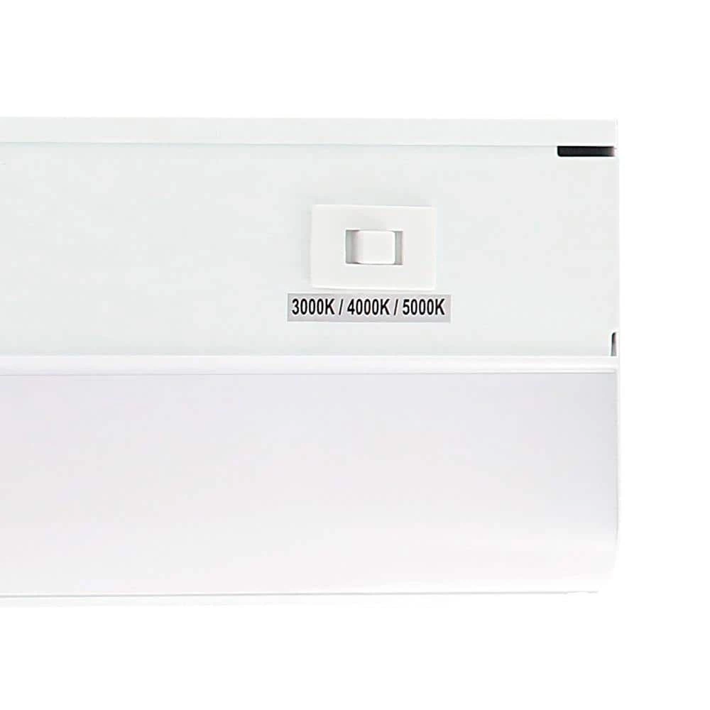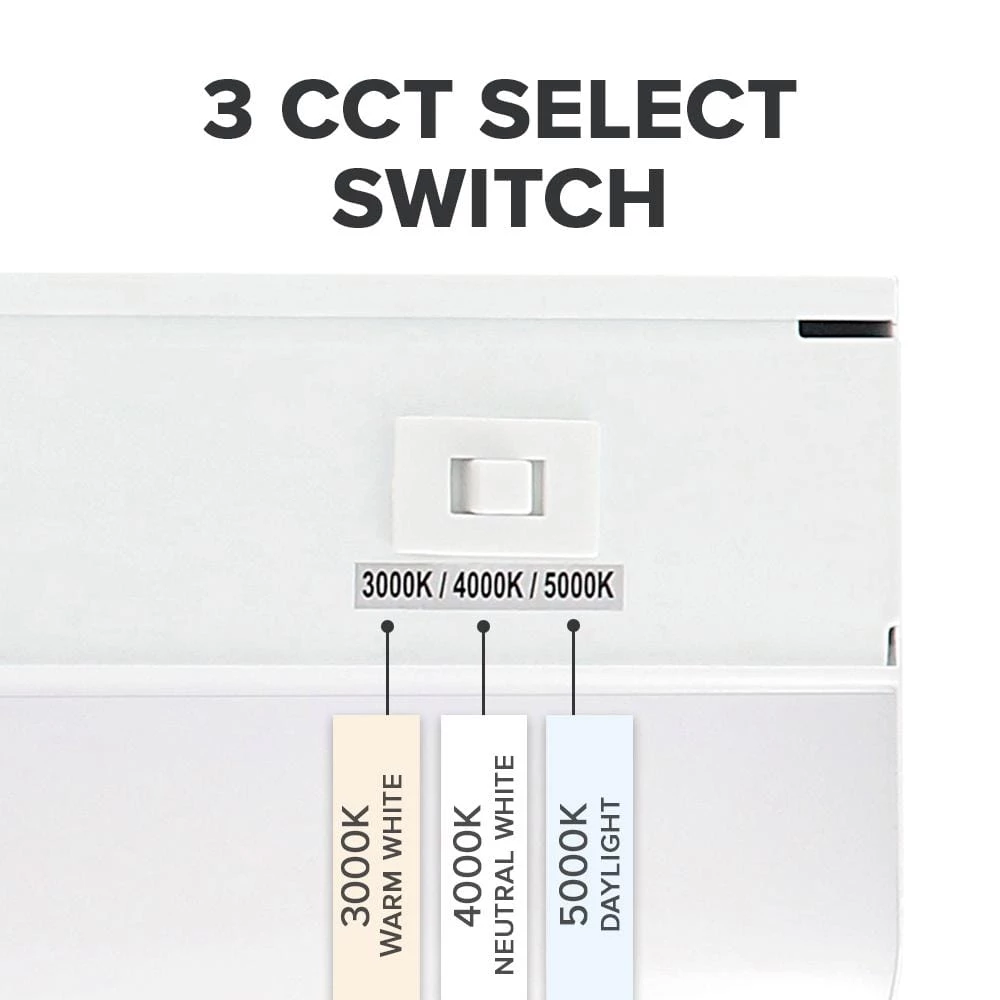 - 18 in. – 9-Watt, 750 Lumens, 3 CCT LED under cabinet lighting, this fixture allows you to select 3000K, 4000K or 5000K for your color temperature with the slide switch on the fixture