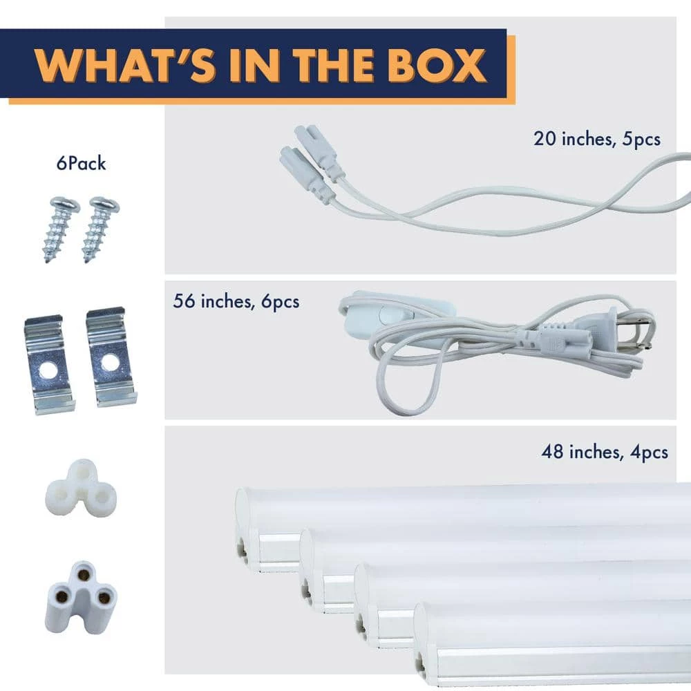- Everything you need: this T5 fixture set comes with everything that you need to install them in a multitude of configurations includes 4 T5 4 ft. LED light, 8 screws, 2 butt connectors, 8 mounting clips, 2 linking cord, 4 power cords with plug