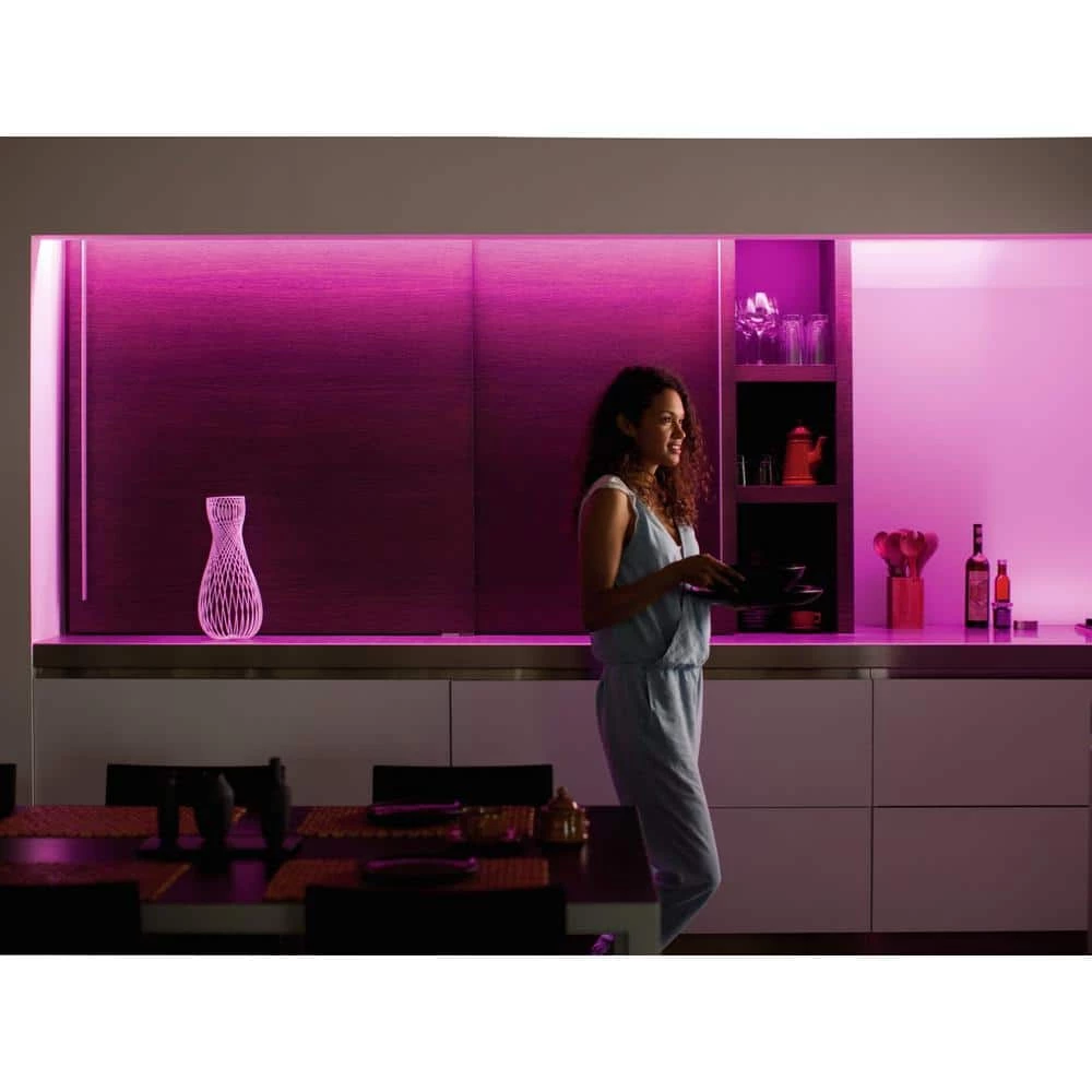 Get colored smart light anywhere in your home with the latest Philips Hue White and Color Ambiance Bluetooth-enabled lightstrip. This extension includes a 40-inch white and color lightstrip and extender. This lightstrip is made to extend your Philips Hue Bluetooth-enabled lightstrip base kit and does not work as a stand-alone product or with older versions of Hue lightstrips. Extend the Bluetooth-enabled base kit up to 32 feet with the extensions (each sold separately in 40-inch increments). The Hue lightstrip is flexible, allowing you to bend, shape, cut, and extend it to adapt to your room and decor. Create an immersive experience with smart light by placing it under cabinets, along a bar, or behind entertainment centers. This Hue lightstrip features Bluetooth capability for instant light control in one room. Get hands-free control when you pair with a voice or smart home assistant, such as Amazon Alexa, Google Assistant, and Apple Homekit. All Bluetooth-enabled products easily connect to a Hue Bridge (sold separately) to unlock the full suite of smart lighting features like timers, routines, sync with media, and away from home control. The Hue Bridge allows you to add up to 50 lights – indoors or outside – for a full smart home experience.