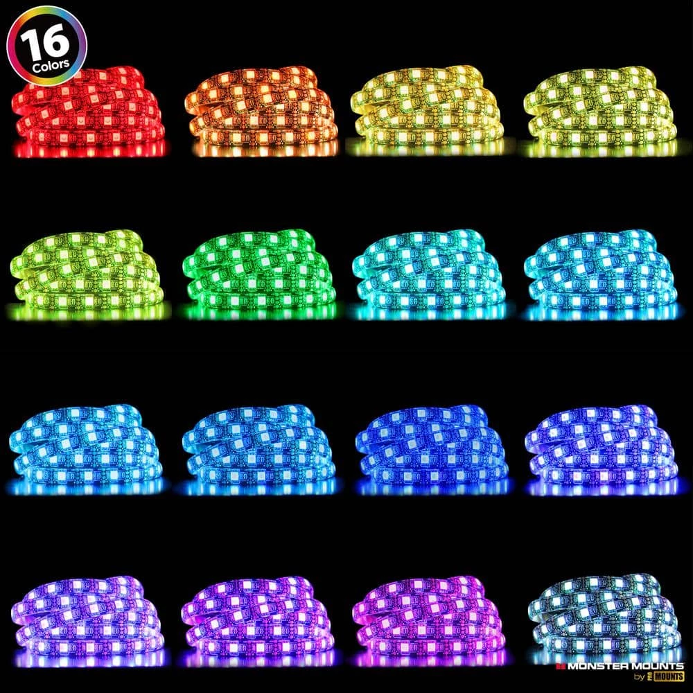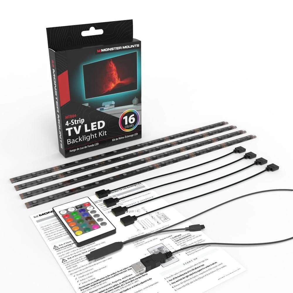 Give your TV an edge and reduce eye strain with the MTB04 LED TV Backlight Kit from Monster Mounts. The MTB04 is an LED backlight kit that attaches to the back of your tv. The MTB04 work with both freestanding and mounted TVs and can be plugged into the back of your TV directly via a USB port. This allows for the lights to be turned on and off with your TV. The MTB04 has 16 color options and 4 dynamic themes, allowing you to express yourself, all while helping reduce eye strain when in dim lighting situations. Included in the box is an easy to understand user manual with pictures that demonstrate every step needed. There are also multiple screw sizes included to ensure compatibility with as many TV brands as possible. Take a look at the other monsters in our cage. With a variety of stylish, quality products, we promise that one of them will work for you. Make your viewing experience into the beast it deserves to be with a Monster Mount.