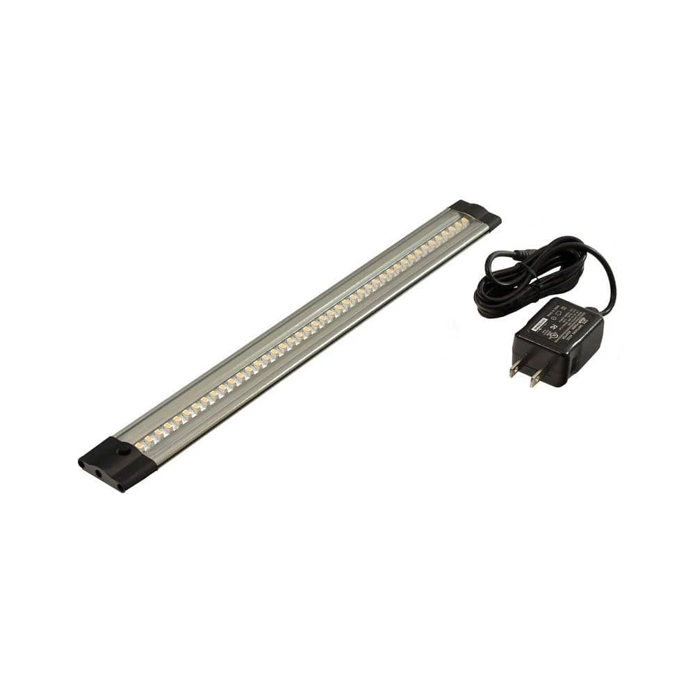 Low profile, slim aluminum LED Under cabinet fixture with 48 LEDs is perfect for under cabinet or task lighting applications. This fixture emits 271 Lumens per strip. The Eco-Strip Light comes complete with all the parts you need for installation and installs in just minutes. The fixture is very bright and extremely energy efficient. It is backed by a 2 year warranty and is designed and engineered by a 74 year old Chicago based manufacturing company. It has a pleasing warm white (3000K) color. The fixtures can be chain linked together with linking cable (included) or placed right next to each other with the butt connector (included). They cannot be hard wired.