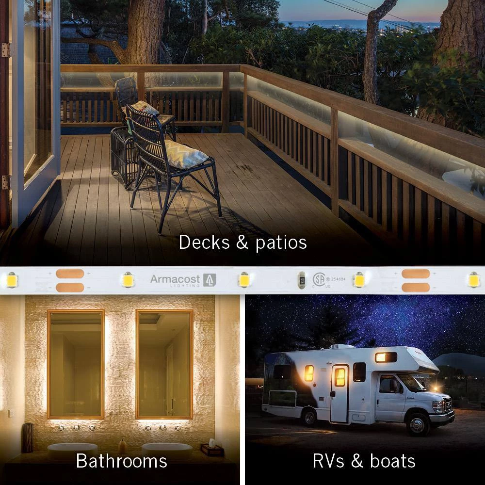 Armacost Lighting’s RibbonFlex Pro Outdoor LED Tape Light is the perfect LED light strip for low-voltage, energy-efficient accent lighting projects. These LED strip lights are designed to meet the layout and installation requirements of lighting professionals and feature high quality, professional-grade components that are longer lasting and create a premium look. 12V strip lights are easy-to-install and feature 3M adhesive backing for a permanent hold. LED light tape is ideal for many applications including under cabinet lighting, tray ceiling lighting, toe kicks, RVs, boats, motor homes and commercial spaces. RibbonFlex Pro Outdoor LED Tape Light is part of Armacost Lighting’s premium-quality component-based system, designed for custom installations. The strip light is rated up to IP64, meaning it can be used in wet locations, but is not submersible.