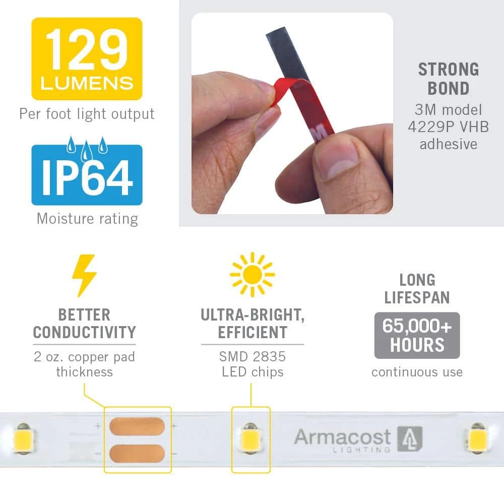 Armacost Lighting’s RibbonFlex Pro Outdoor LED Tape Light is the perfect LED light strip for low-voltage, energy-efficient accent lighting projects. These LED strip lights are designed to meet the layout and installation requirements of lighting professionals and feature high quality, professional-grade components that are longer lasting and create a premium look. 12V strip lights are easy-to-install and feature 3M adhesive backing for a permanent hold. LED light tape is ideal for many applications including under cabinet lighting, tray ceiling lighting, toe kicks, RVs, boats, motor homes and commercial spaces. RibbonFlex Pro Outdoor LED Tape Light is part of Armacost Lighting’s premium-quality component-based system, designed for custom installations. The strip light is rated up to IP64, meaning it can be used in wet locations, but is not submersible.
