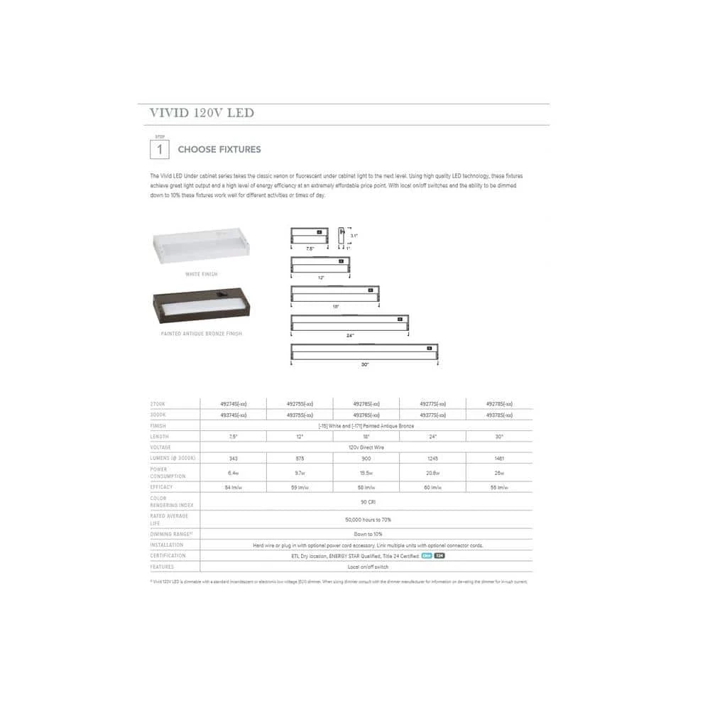 The Vivid LED Self Contained Undercabinet series by Sea Gull Lighting brings the classic xenon or fluorescent under cabinet light to the next level of sophistication. Using high quality LED technology, these fixtures achieve great light output and a high level of energy efficiency at an extremely affordable price point. Available in 5 sizes (7.5, 12, 18, 24 and 30) and two finish options (White and Antique Bronze) for full versatility. With local ON/OFF switches and the ability to be dimmed down to 10%, these fixtures work well for different activities or times of day.