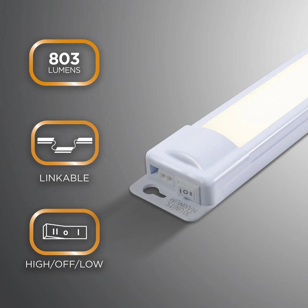 See your home in the best possible light with the Ultra ProGrade EZ Link Linkable Plug-in 24 in. LED Under Cabinet Light. This energy-efficient fixture is the ideal solution for any room in your home, adding light wherever extra-light is needed. with the ability to link 30 fixtures while only using a single outlet, get the perfect amount of light for any size room. in addition to being able to plug into an outlet, the light can be wired directly to a wall switch using the optional Ultra ProGrade ProLink Direct Wire Junction Box to eliminate visible cords. To achieve stylish accent lighting in moments, simply mount the light underneath or on top of kitchen cabinetry, shelving or bookcases using the keyhole slots located at the end of each fixture. in smaller enclosed areas, such as closets and pantries, use the lights to illuminate hard-to-see corners – the light’s slim design makes it convenient to place in locations with limited space. The toggle switch makes it easy to operate, allowing you to choose between high and low settings, as well as turn the light off. Make life a little brighter with the Ultra ProGrade EZ Link Linkable Plug-in 24 in. LED Under Cabinet Light.