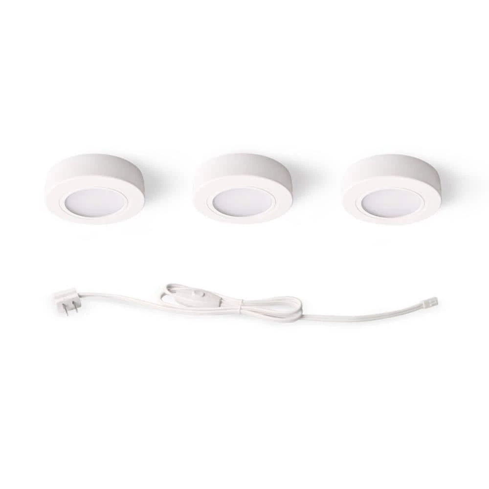 - Three 3-Watt LED puck lights with 2 ft. cable attached, 4 ft. adjustable power cord with on/off switch