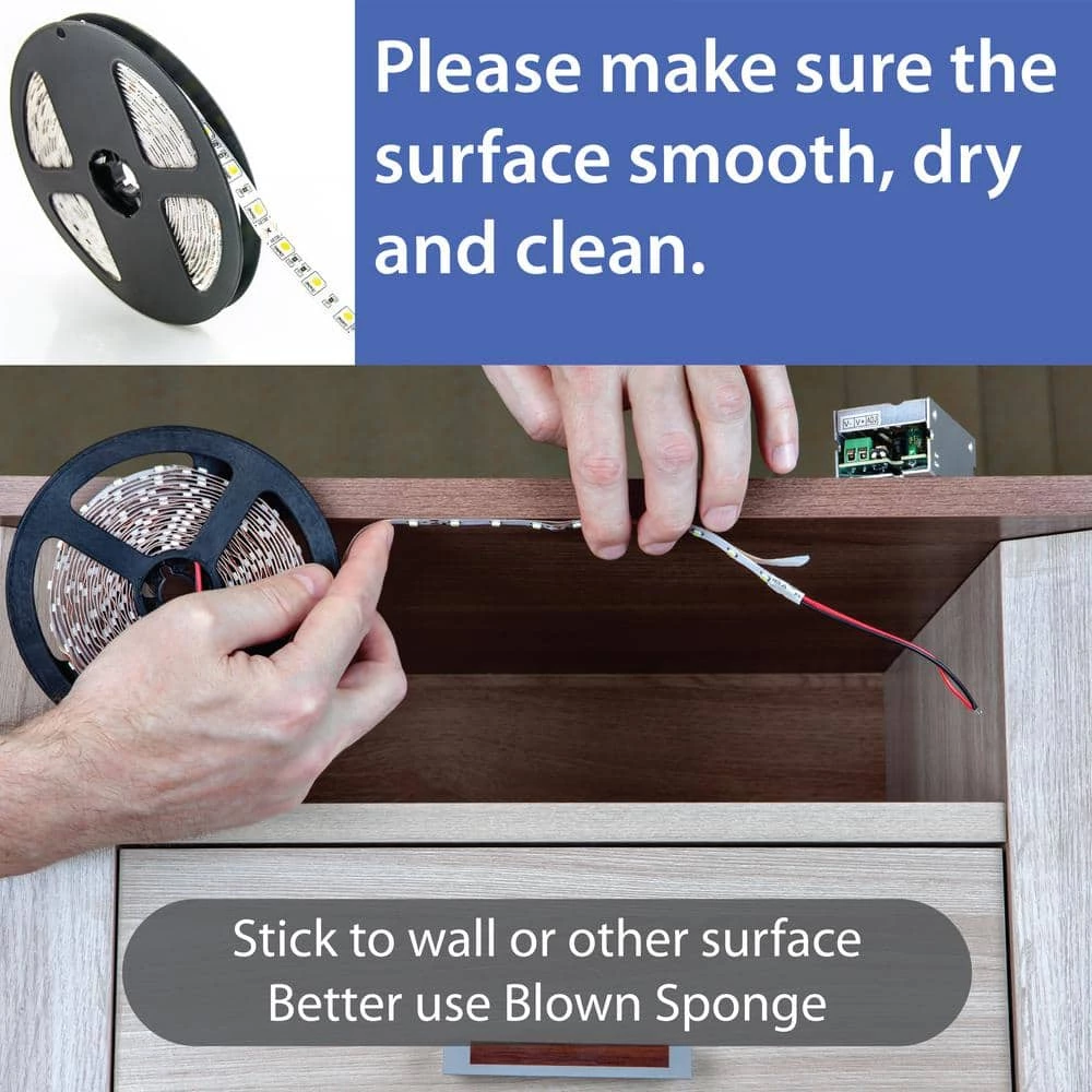 WBM SMART LED strip lighting is great for indoor applications including under cabinets, accents, or any space a low profile and flexible lighting solution is needed. Dimmable with included wireless remote; RF technology works through walls up to 16 ft. x 2 ft. away. 3 M. adhesive backing for easy installation. Can be plugged into a standard outlet or direct wired.