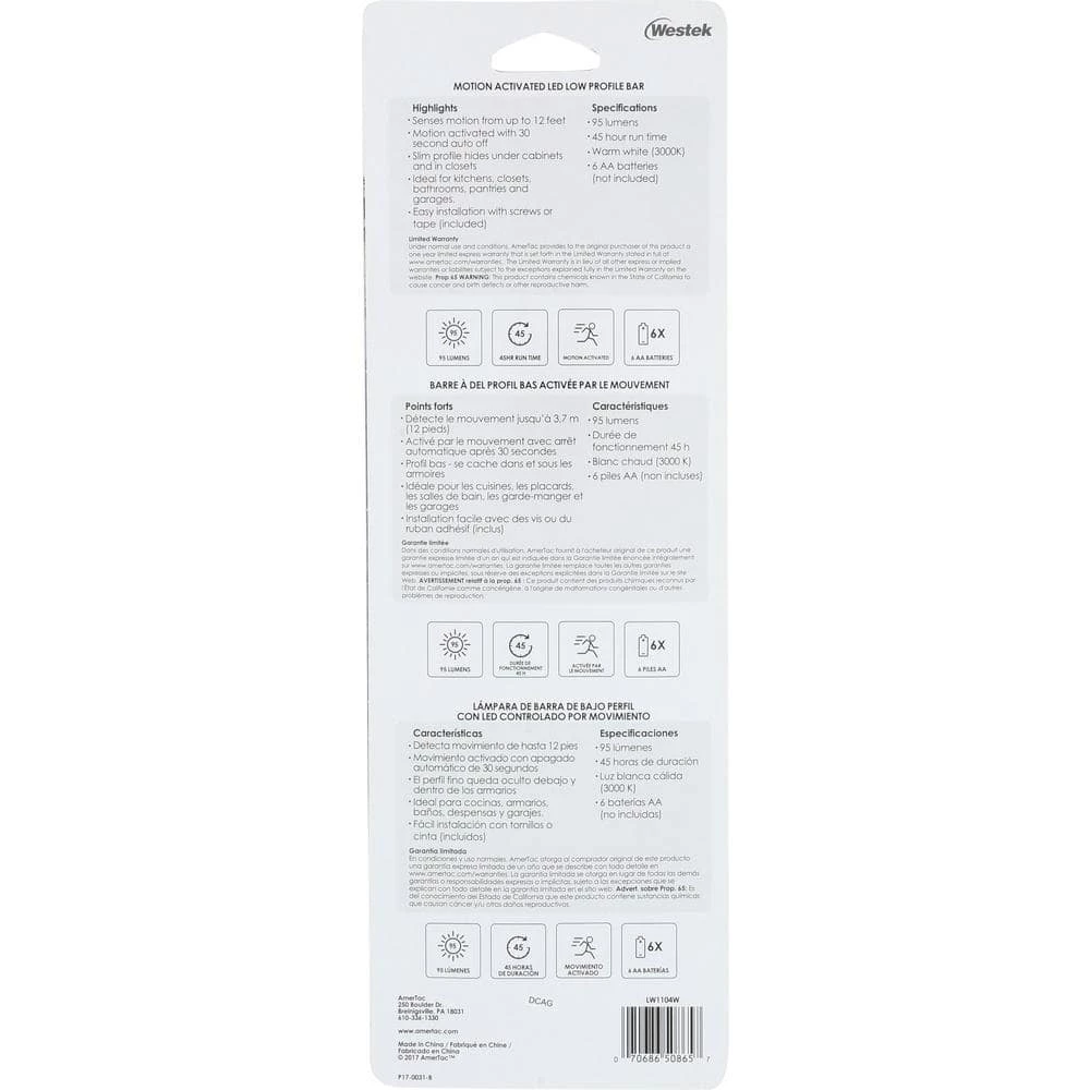 The Westek LW1104W-N1 Low Profile Bar Light is the perfect way to add illumination to any space. This device turns on when motion is detected with a 30 second auto-off. Provides 95 lumens of warm white illumination with a dim mode for low light needs. Great for work spaces, bedrooms, hallways, entryways, basements, bathrooms and more. This device is powered by 6 AA batteries (not included) and has a run time of 35 hours. Designed with a modern style that works with any decor. AmerTac manufacturing brands offer complete lines of distinctive decorative home accent products that include trend-setting wall plates, money saving LED night lights, innovative under cabinet lighting and LED battery operated lights. We also offer utility product lines including energy-saving timers, dimmers and lighting controls, as well as an extensive offering of consumer electronics accessories for the home and office.