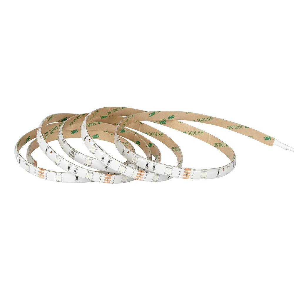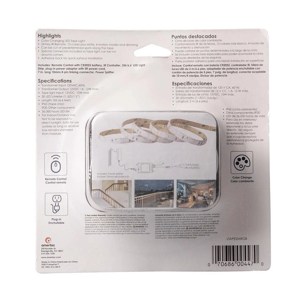 The Westek LTAPE2MRGB 6.6 ft. LED Color Changing Tape Light with Remote transforms spaces like no other. Add creative color lighting to tray ceilings, coves, under cabinets, architectural elements and more. Choose from 16 colors with 4 settings for flashing and fading. You can also easily adjust the brightness and flashing speed via the IR remote. Features a power splitter where you can run cut tape in two directions from power source. Perfect for applications where power outlet is centrally located. 3M high-bond tape backing makes installation as easy as peel-and-stick. It can be cut at predetermined spots along the tape and it comes with a special connector so tape light can be linked or run around corners. This kit includes 6.6 ft. LED light strip, plug-in power adaptor with 5 ft. power cord, IR controller, 24 Key remote, 7 in. 10 mm 4-pin linking connector. Specifications: 30 LED’s/m (1 LED/1.3 in.); Transformer Input : 120VAC 60Hz; Transformer Output: 12VDC 1 Amp; Length: 2 m (6.6 ft.); Color Temp: White is 3000K plus color changing. IP 65 Tape, IP20 components. For Indoor/Outdoor Use. Not to be exposed to direct sunlight. Safe for use outside as long as receiver box remains sheltered.